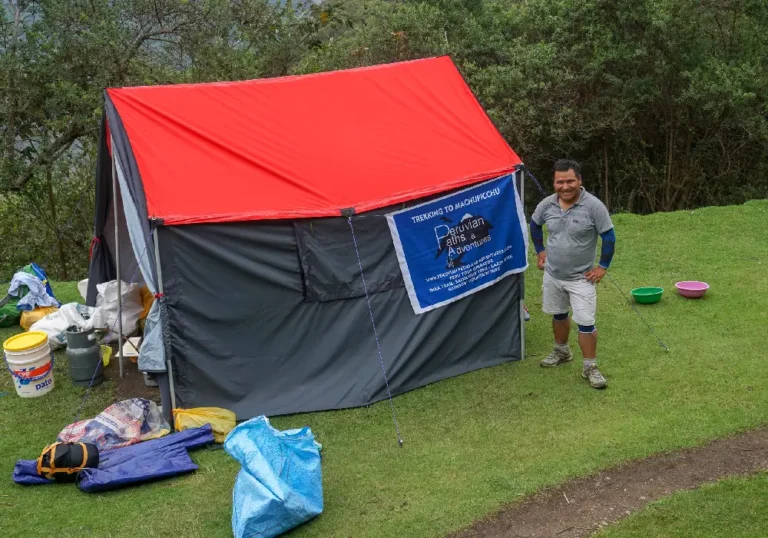 After breakfast, we will walk 16 km (9.9 miles), it is the longest day of the Inca Trail, but also the most beautiful and interesting because we will see more archaeological centers and different ecosystems. After getting up and having breakfast, we will begin to ascend to the next step that will take us 2 hours. On the way up we will visit an archaeological center called Runkuracay, which is a very interesting archaeological center due to its circular shape and its location. It is said that this place was a refuge for walkers and a control on the way. After having a tour in this archaeological center, we will continue climbing up to the second pass called Runkuracay which is at 3,941 masl or 12,800 feet. Then we will descend for 2 hours to the place of lunch, and on the way down we will visit an archaeological site called Sayaqmarka, which means «Site in a Steep Place.» Here we can see an important temple dedicated to the Salkantay Mountain, which is the highest in this area. Then we will arrive at Chaquiccocha for lunch and then we will continue walking for 4 more hours until we reach our next camp. The first part of this road will be relatively flat with ups and downs until we reach our next archaeological site called Phuyupatamarka which means «City above the Clouds.» Here we will see water sources where the Incas took special baths to purify themselves before visiting the Inca city of Machu Picchu. Here we also have the Phuyupatamarka camp, which is the second option for camping on the third day. After the tour, we will go down until we reach the agricultural terraces of Intipata. Then we will continue descending to our Wiñaywayna camp, which means «Forever Young» and is at 2,650 masl or 8,694 feet. This is our last night in the camp, and after our dinner, we will thank our support staff (porters) for their work.