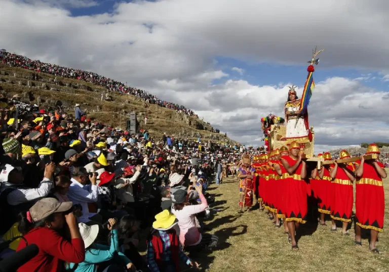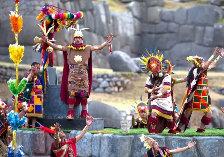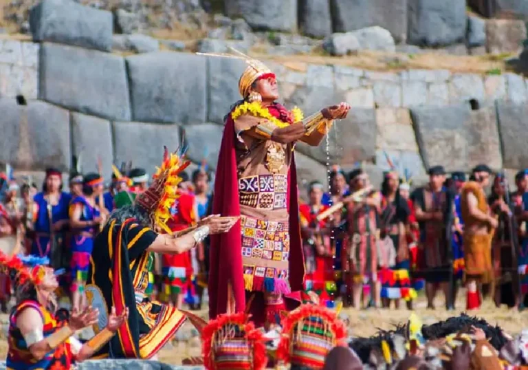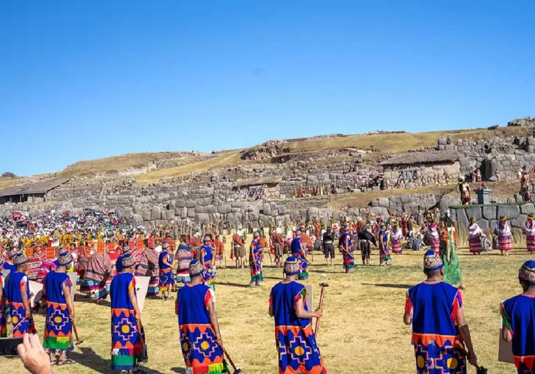 1.- Qorikancha or Temple of the Sun, beginning of the Inti Raymi route with the ceremony called «Salute to the Sun». This first part begins with the sound of the pututos and the entry of the acllas, musicians and dancers, to later receive the Inca, this place begins the first rituals. Duration approx. of 1 hour. 2.-Plaza Mayor of Cusco or Huaqaypata (Main Square of Cusco). , is the second point of celebration of Inti Raymi. Here the «Meeting of the Times and Coca Leaf Ceremony» ceremony takes place, where the Inca and his entourage meet on the great ushnu or ceremonial stage. This second part begins with the entry of the musicians, beginning the entire presentation, so that the Inca then heads towards the main altar installed in the center of the plaza, beginning with a greeting to the sun god, then he makes himself present. . the provincial mayor of Cusco, having a meeting with the Inca, giving him this quipu as a symbol of organization, work and commitment, finally the Inca and the Qoya surround the main square to later go to the last stage of this ceremony, Sacsayhaman. 3.- Explanada de Sacsayhuamán, is the third epicenter of the Inti Raymi and the central ceremony, since this is where most of the staging of the Inti Raymi is concentrated, starting with the entrance of the Qoya and the Inca accompanied by dances, music and chants, and then begin the central ceremony with the appearance of the leaders of the 4 of theirs announcing the state in which their regions are located, so that finally the Inca begins the rite of offering, sacrificing a llama in honor to the sun god. Duration approx. of 2 hours.